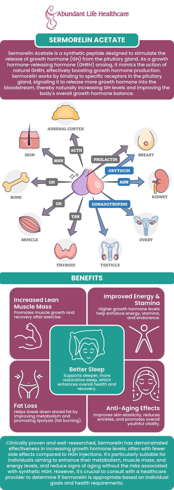 At Abundant Life Healthcare, we carefully evaluate each patient’s medical history, symptoms, and lab results to determine if growth hormone–related therapy is appropriate. While Sermorelin is not recommended for healthy adults with normal hormone levels, it may be considered for adults with documented growth hormone deficiency or those experiencing significant symptoms that impact quality of life.